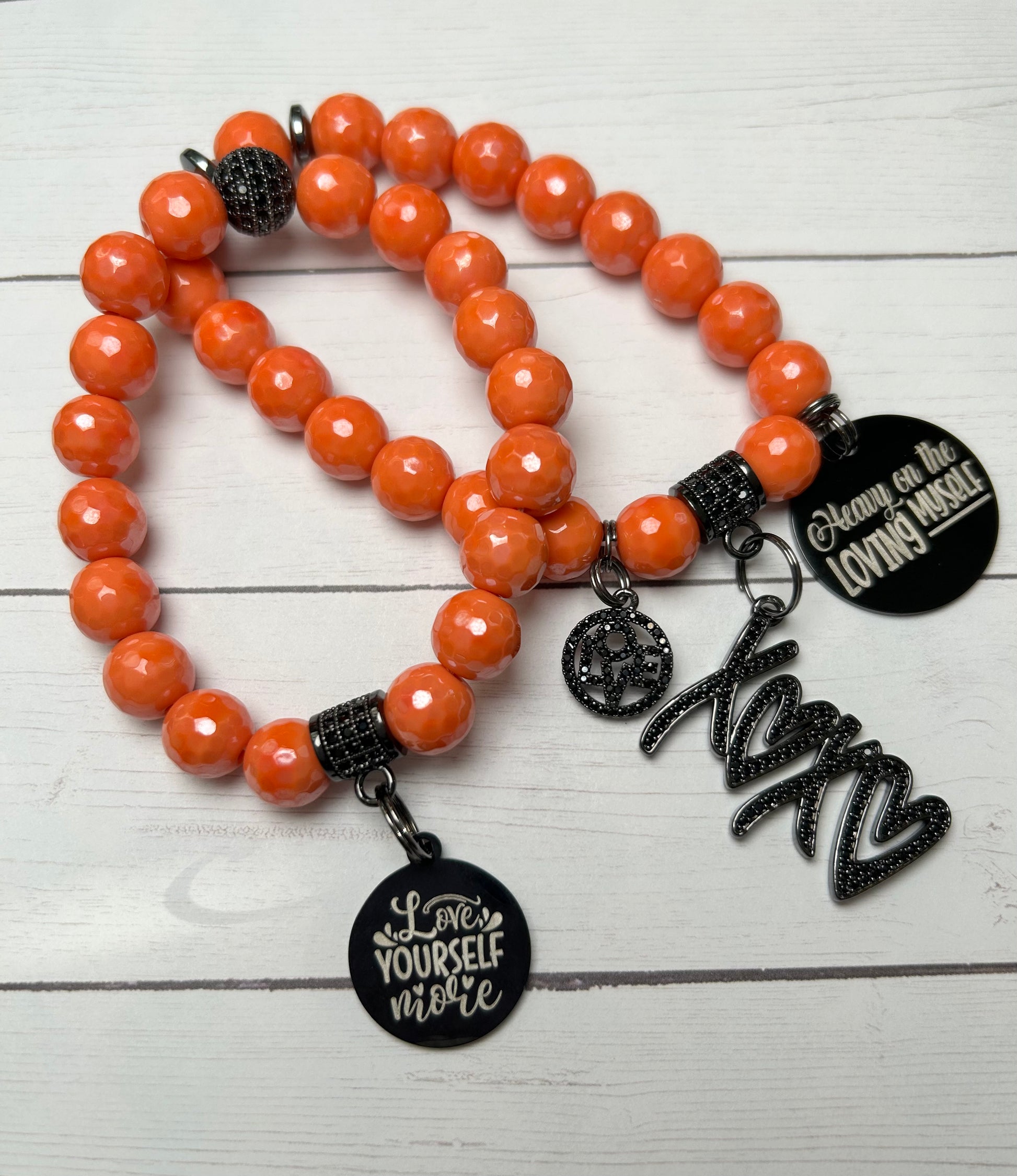 2 strand coral gemstone beads with black charms/spacers. 10mm beads. Fits 7-7.5 inch wrists.