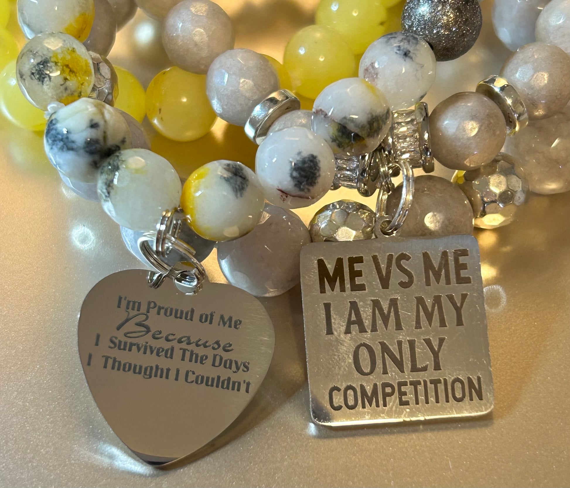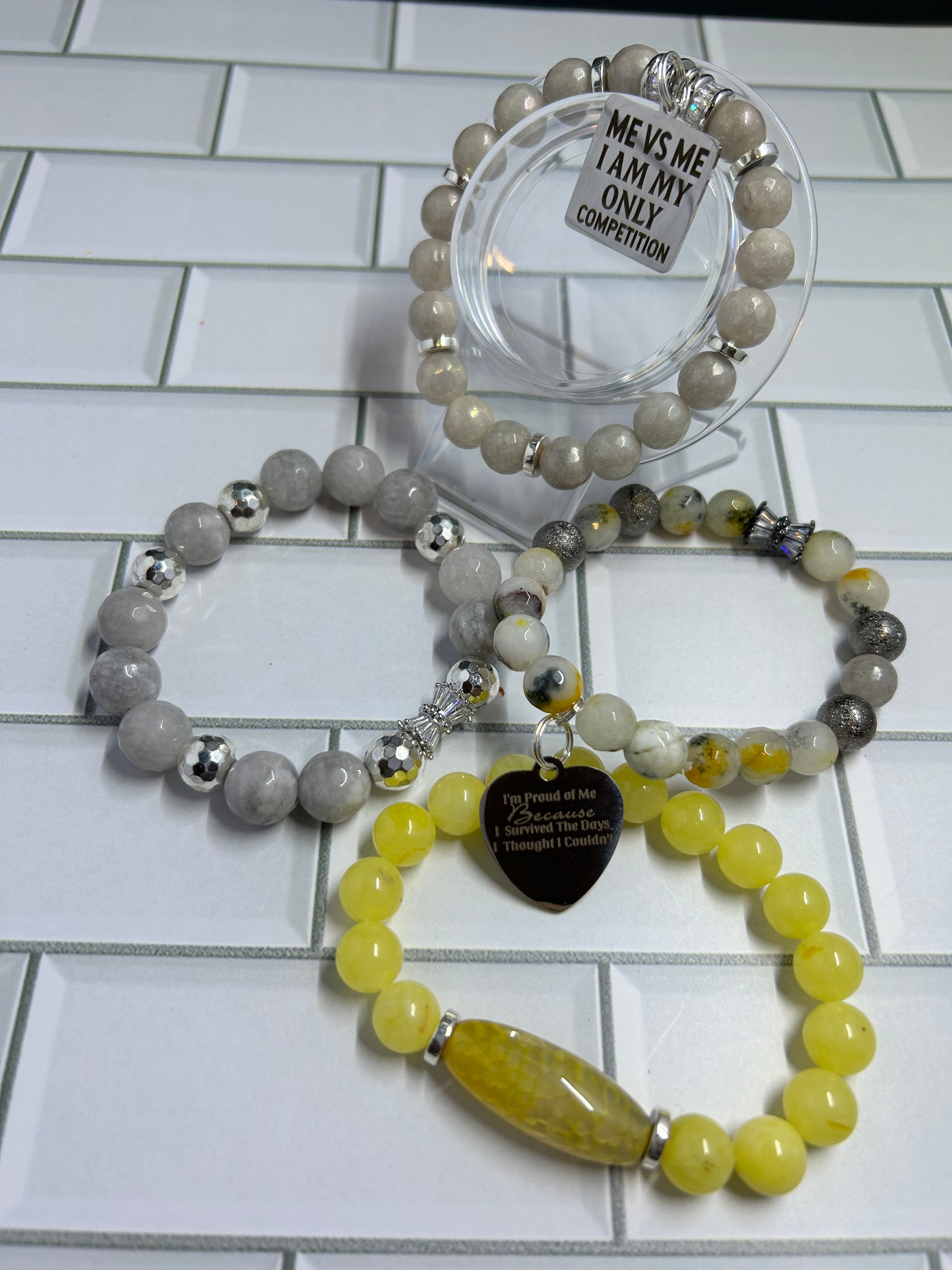 4-Stack of semi-precious gemstone with silver word charms and silver hematite beads and spacers. Can be worn as a set, individually, or in pairs. 10mm and 12mm stones.