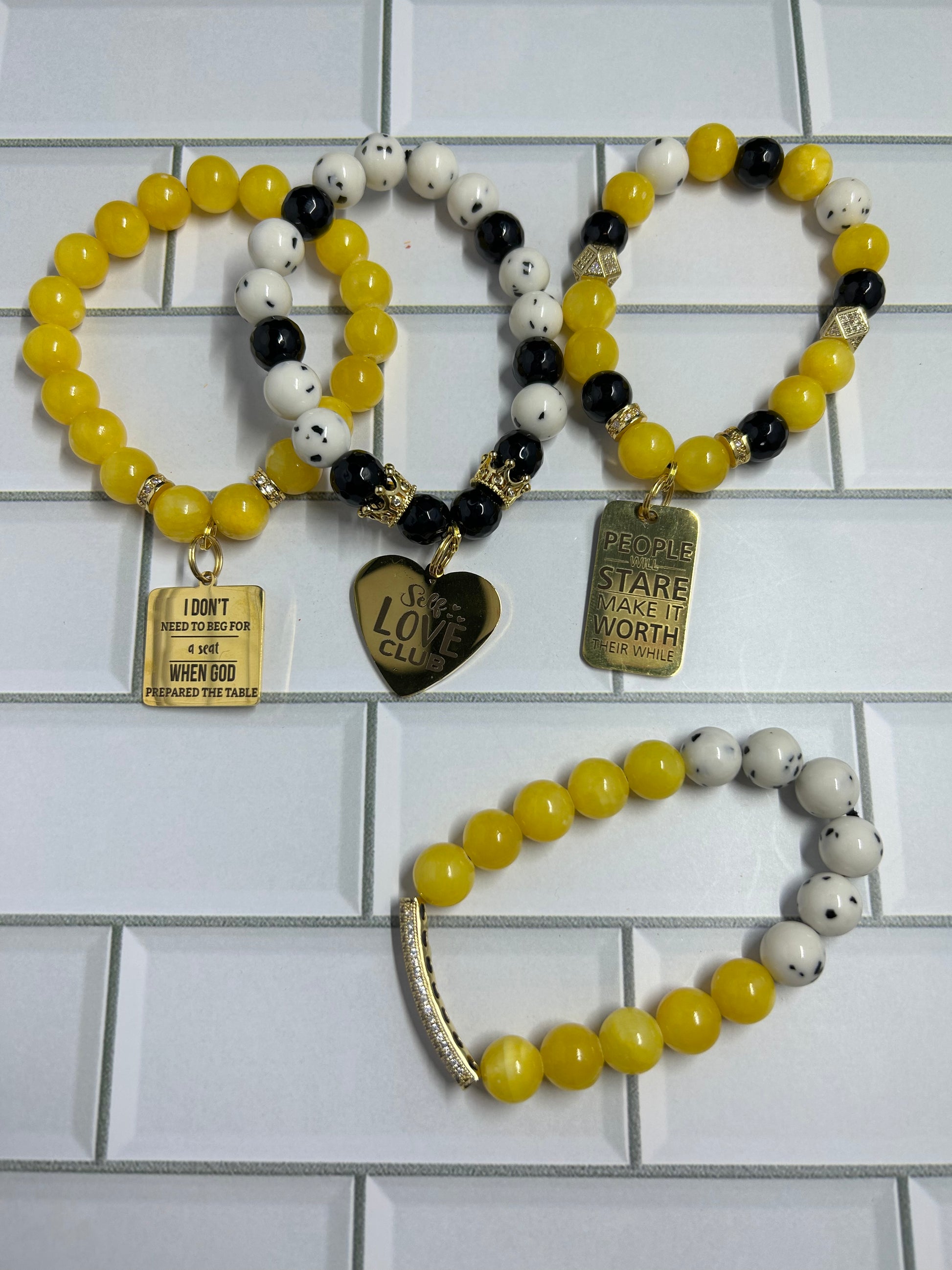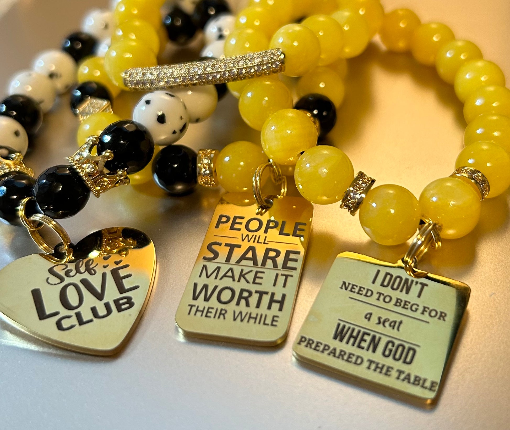 4-Stack of semi-precious gemstones gold word charms and gold hematite beads and spacers. Can be worn as a set, individually, or in pairs. Made with 10mm stones.